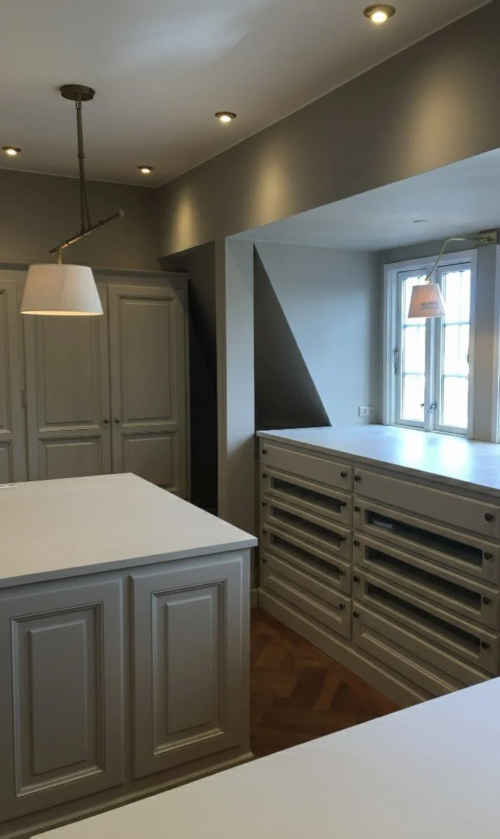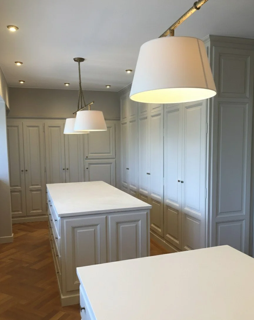 Et stort walk-in closet med smukke fyldninger skaber en elegant og rolig ramme om hverdagen. Løsningen er designet med generøs plads til både hende og ham, hvor funktionalitet og æstetik går hånd i hånd. De klassiske fyldningslåger tilfører varme, dybde og et tidløst udtryk, der løfter rummet fra opbevaring til oplevelse.