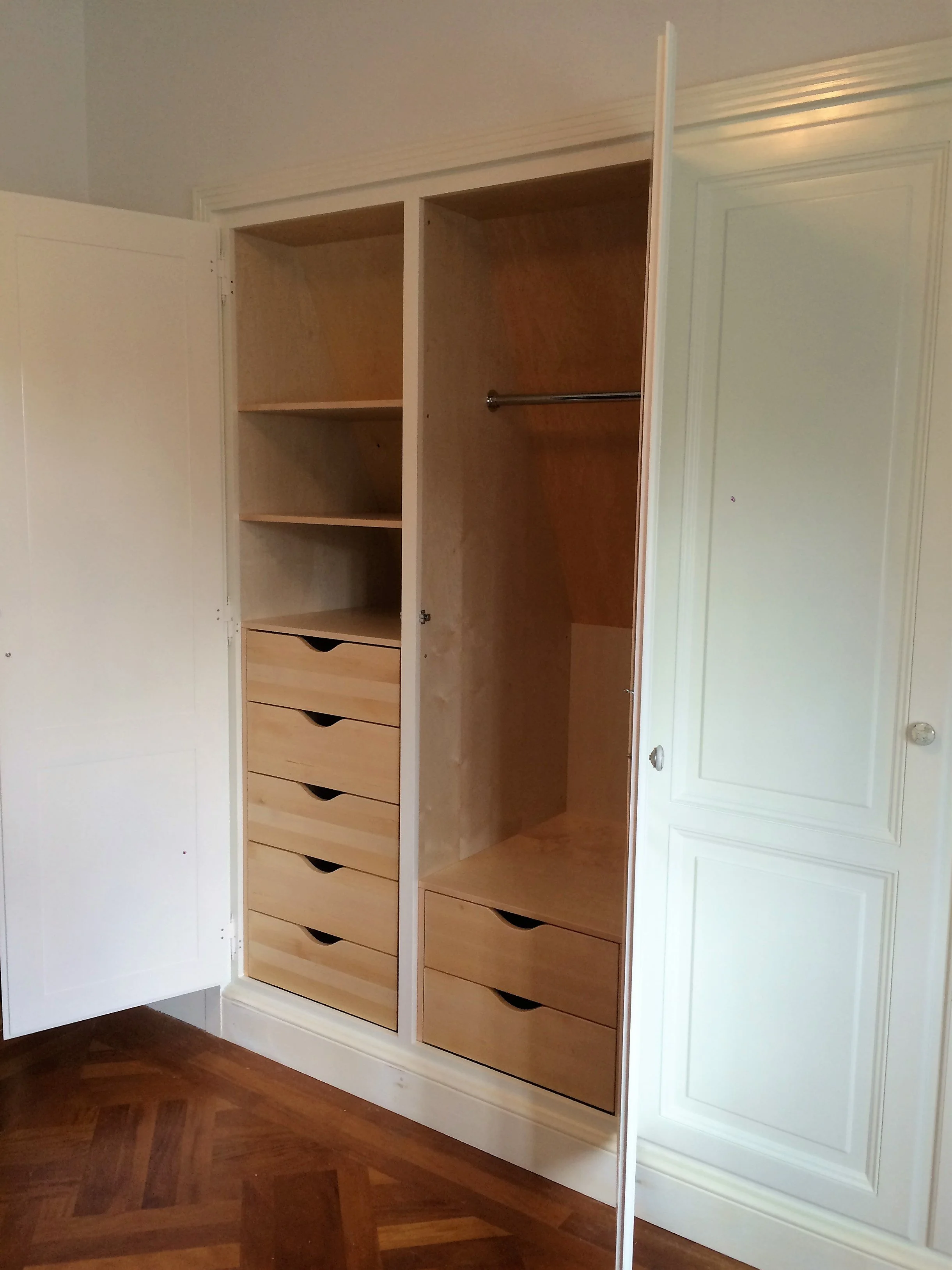 Indretningen er gennemtænkt med tydelig opdeling, så begge får deres egen plads – med bøjlestænger, skuffer og hylder tilpasset individuelle behov. Samtidig bindes rummet sammen af en harmonisk helhed, hvor materialer, proportioner og detaljer er nøje afstemt.
