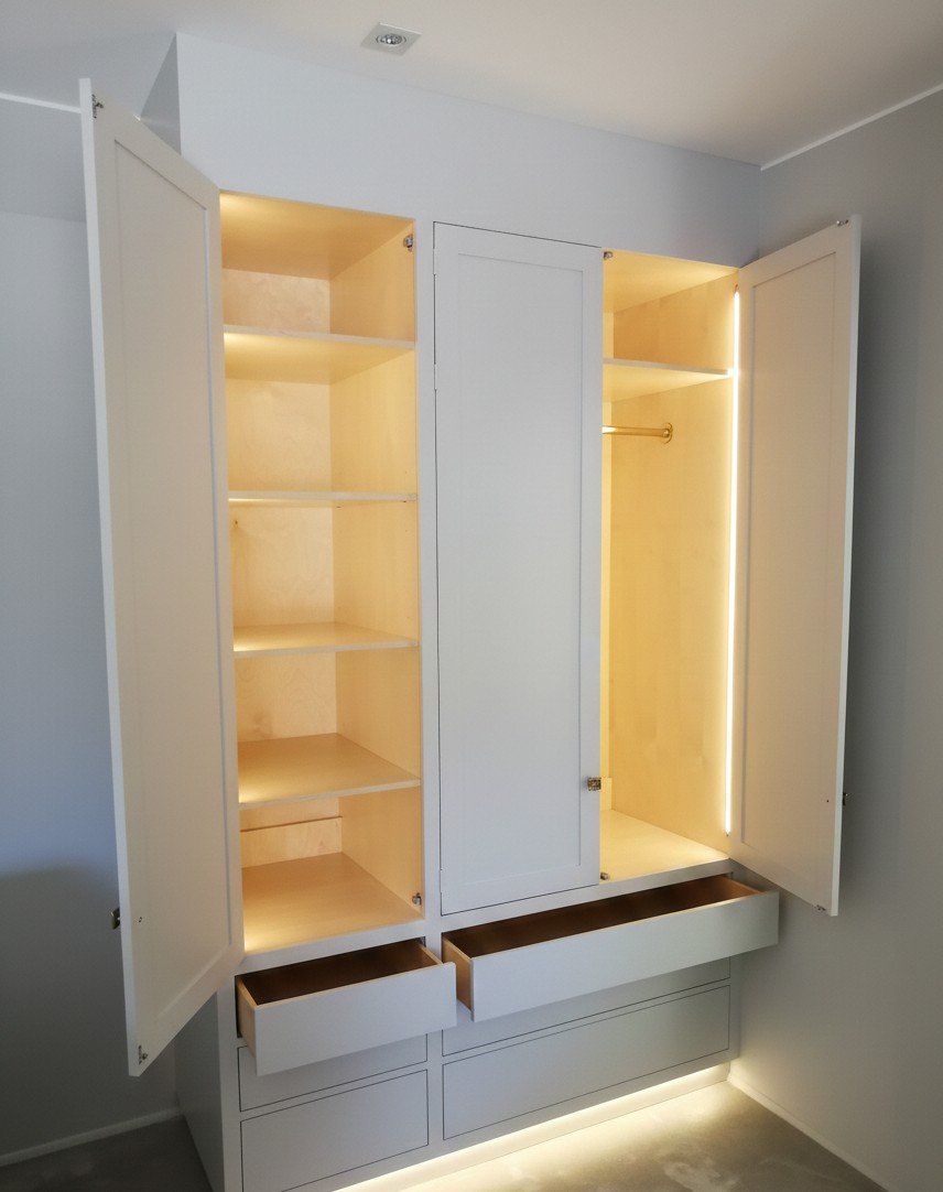 I børneværelserne er der skabt garderobeløsninger, som er integreret i rummene og malet, så de fremstår som en naturlig del af arkitekturen.