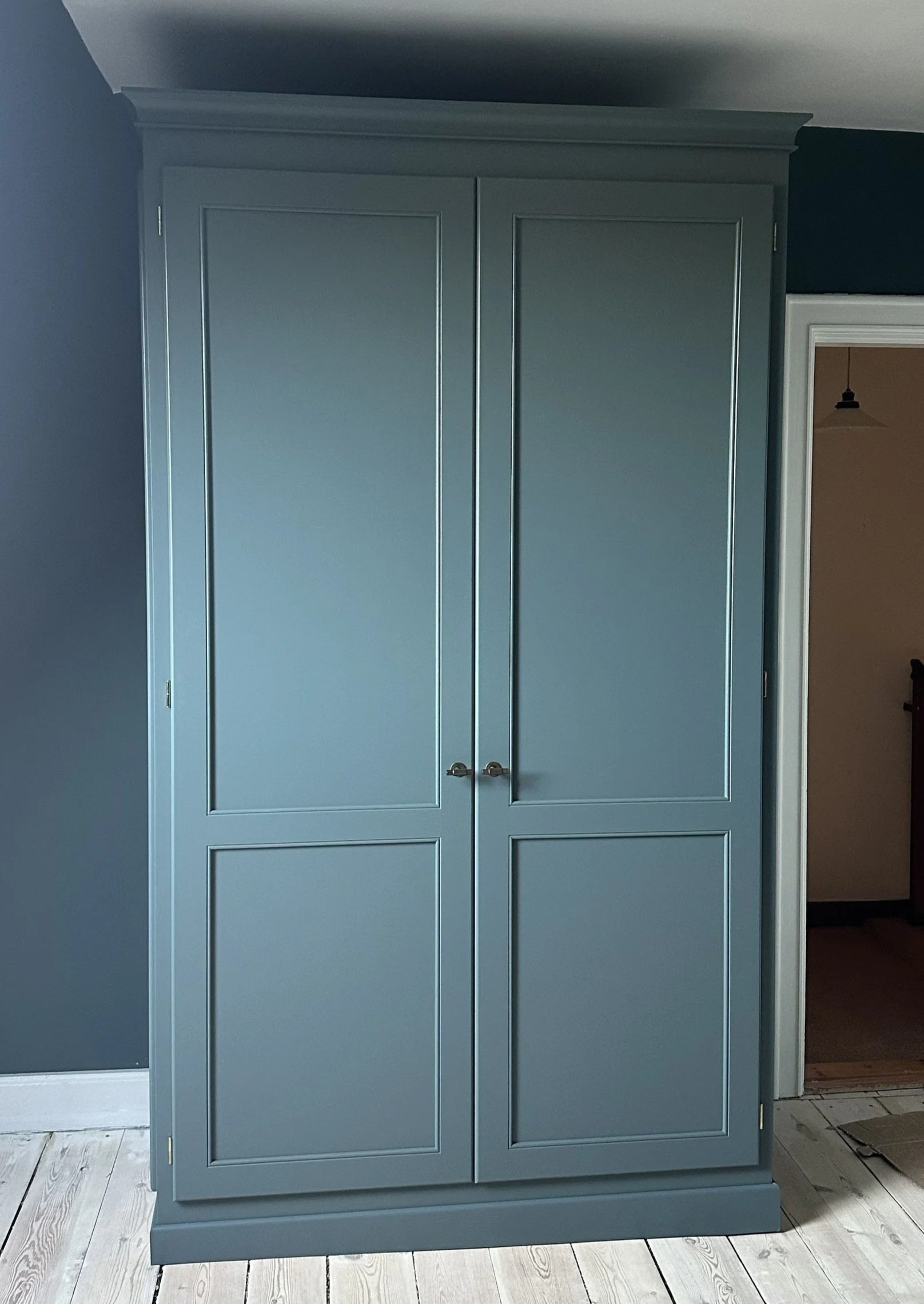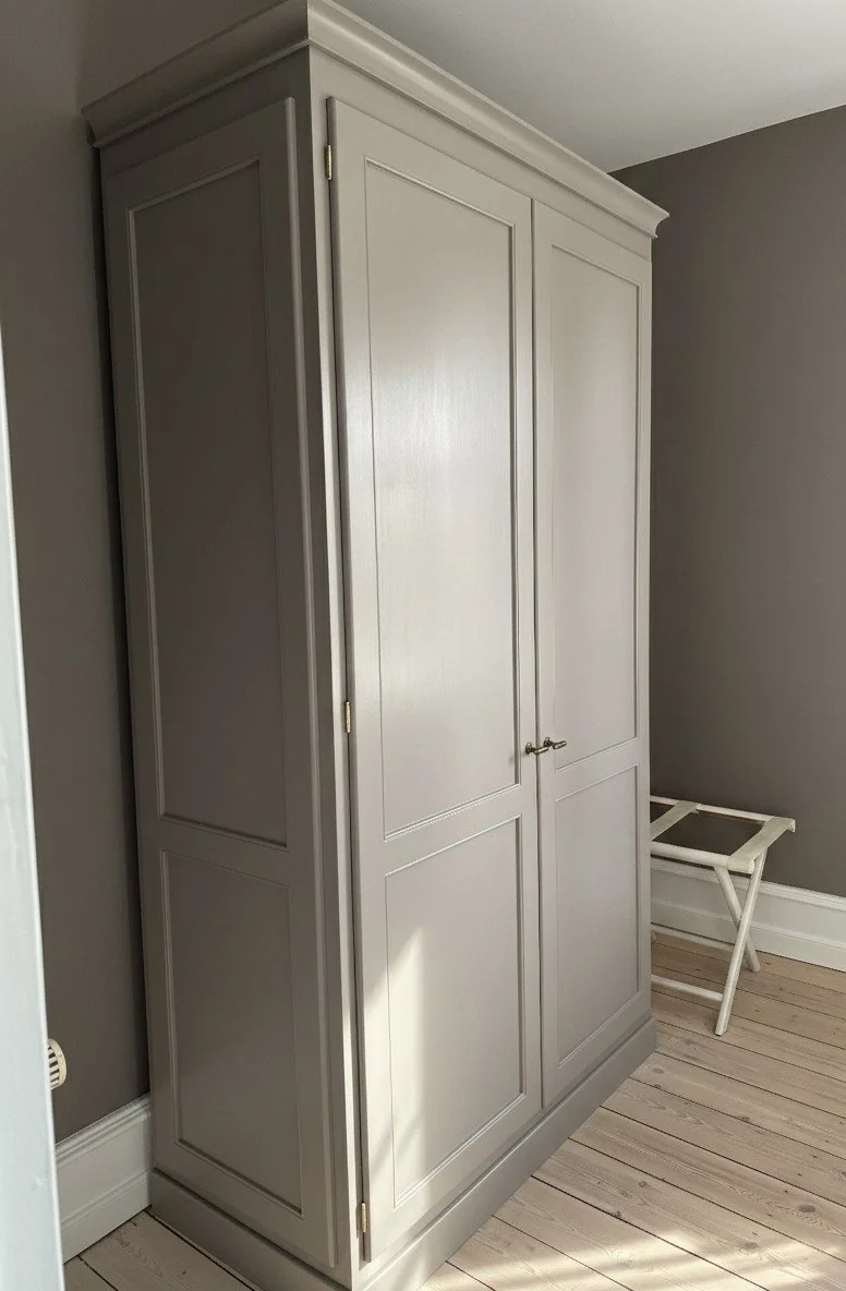 en gammel portnerbolig var der behov for en praktisk løsning med fritstående skabe til gæster. Derfor blev der tegnet skabe, som er malet i samme farve som væggene, så de falder naturligt ind i rummet og fremstår som en integreret del af indretningen.